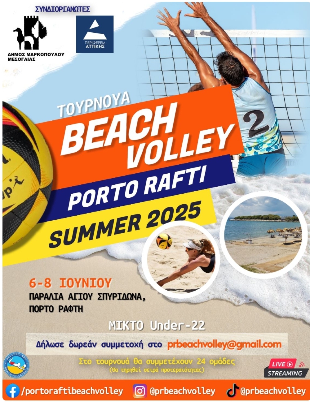 Από την Παρασκευή 31 Μαΐου έως και την Κυριακή 2 Ιουνίου, το Πόρτο Ράφτη φιλοξενεί το 1ο Τουρνουά Beach Volley στην παραλία του Αγίου Σπυρίδωνα.