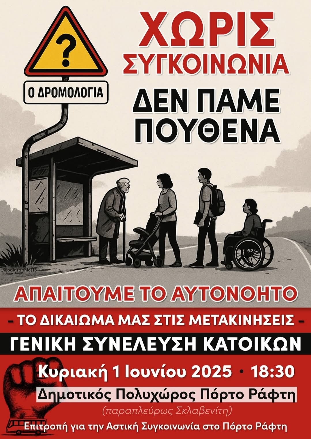 Η Επιτροπή για την Αστική Συγκοινωνία στο Π. Ράφτη απευθύνει κάλεσμα σε όλους τους κατοίκους, τους συλλόγους, τις δημοτικές παρατάξεις και τους φορείς του Δήμου Μαρκοπούλου, για συμμετοχή σε Γενική Συνέλευση. Στόχος: να καταγραφούν εμπειρίες, να συντονιστούν κινήσεις και να τεθούν τα επόμενα βήματα για μια συγκοινωνία που να ανταποκρίνεται στις ανάγκες μας.