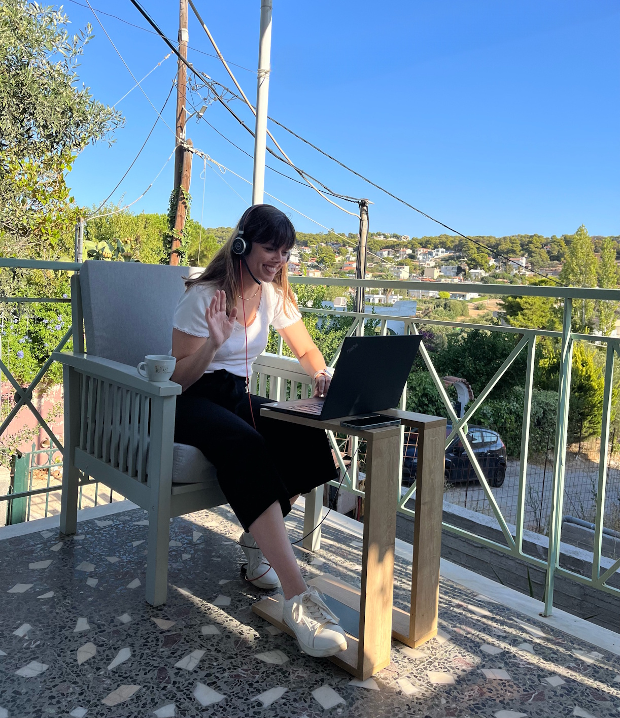 Εργάζομαι στην εταιρεία τεχνολογίας Epignosis και το αντικείμενό μου είναι οι δημόσιες σχέσεις και η επικοινωνία, εστιάζοντας στην αγορά της Αμερικής. Ενώ ήμασταν 100% remote, από πέρυσι εργαζόμαστε με ένα υβριδικό μοντέλο κι εγώ δουλεύω τέσσερις μέρες από το σπίτι και μία από το γραφείο, που βρίσκεται στην Ομόνοια. Περίπου μια φορά τον μήνα πηγαίνω και σε διάφορα events ή συνέδρια για τις ανάγκες της εργασίας μου. Για μένα αυτή είναι η τελεία ισορροπία γιατί συνδυάζω την ευελιξία στην καθημερινότητά μου με την κοινωνικοποίηση με συναδέλφους, που πραγματικά απολαμβάνω.